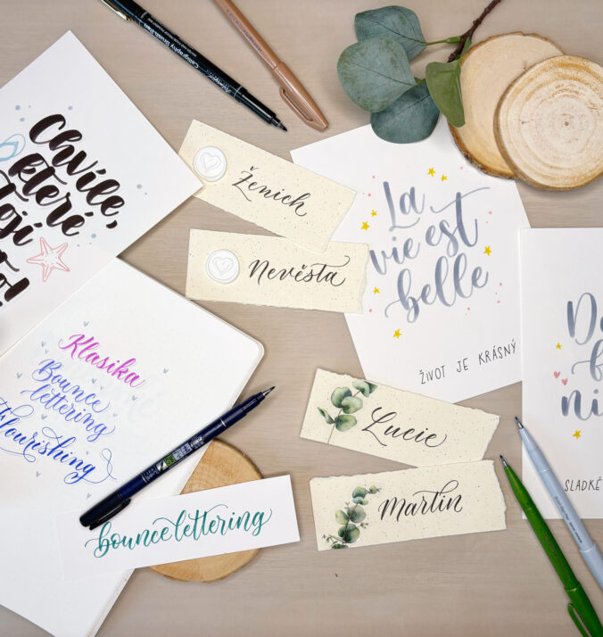 Na kurzu Psaní je hraní se naučíte základy moderní kaligrafie a práci s brush penem – speciálním fixem se štětcovým hrotem. Krok za krokem si projdeme základními tahy, tvorbou písmen. Poradíme vám, jaké pomůcky a materiály jsou nejlepší pro začátečníky. Společně objevíme kouzlo moderní kaligrafie!